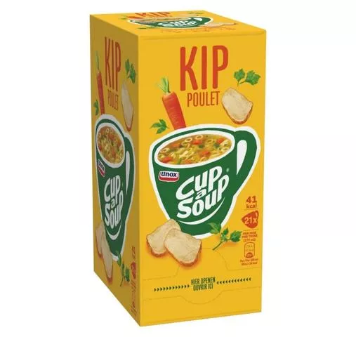 Unox Cup-a-Soup Kip is het hele jaar door lekker. Het is een echte klassieker en erg populair. In de Unox Cup-a-Soup Kip variant zitten geen smaakversterkers, kunstmatige kleurstoffen en conserveermiddelen. Deze opkikker geeft jou net dat zetje energie om weer door te gaan met jouw dag. Op Compliment.nl bestel je eenvoudig en voordelig een pak met 21 zakjes Cup-a-Soup Kip. Ieder zakje is goed voor een kop van 175 ml. Genieten dus. De Cup-a-Soup Kip is ideaal voor zowel bedrijven als particulieren. Schrijf je in voor de nieuwsbrief om nooit meer een Cup-a-Soup aanbieding te missen. Wij verkopen ook de Unox Cup-a-Soup Kip (24x 140ml).