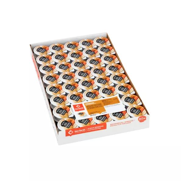 Hygiënisch verpakte Van Oordt pindakaas in cups. Deze smeuïge pindakaas is zeer smaakvol op brood, beschuit én in yoghurt. Perfect om uw gasten te serveren!