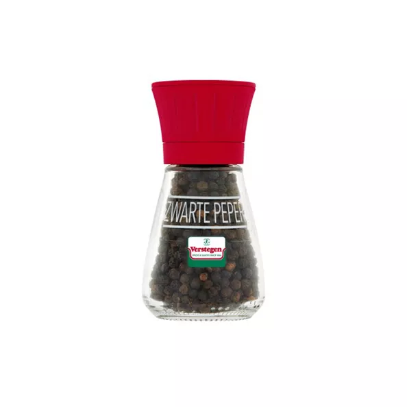 Zwarte peper van Verstegen kan in alle hartige gerechten gebruikt worden. Met zwarte peper geef je net wat meer pit aan je gerecht. Zwarte peper heeft een scherpere smaak dan witte peper. Deze molen van Verstegen heeft twee maalstanden. Voor een fijne maling moet de dop in de lage stand staan. Maar als de dop eenvoudig iets omhoog getrokken wordt, staat hij in de grovere maalstand. Er zitten 6 molens met 40 gram zwarte peper in een doos.
