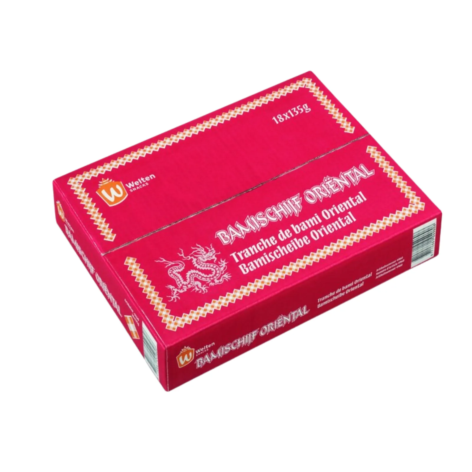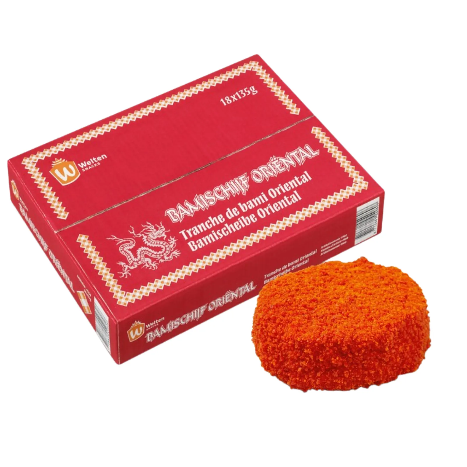 De Welten Bamischijf Oriëntal is een rijkgevulde snack die de liefhebber van de Aziatische keuken direct zal aanspreken. Deze royale schijf van 135 gram is gevuld met smaakvolle mie en een verse groentemix van prei, ui, paprika en kool. De unieke smaakbeleving wordt versterkt door een authentieke combinatie van ketjap, kruidige sambal en een vleugje trassi, wat zorgt voor een pittig en oosters karakter. Dankzij de krokante paneerlaag biedt de bamischijf een heerlijke crunch na het frituren, waardoor het een favoriet is bij gasten en bezoekers. Met deze verpakking van 18 stuks in de vriezer geniet je van optimaal gemak en een constante kwaliteit op de werkvloer.