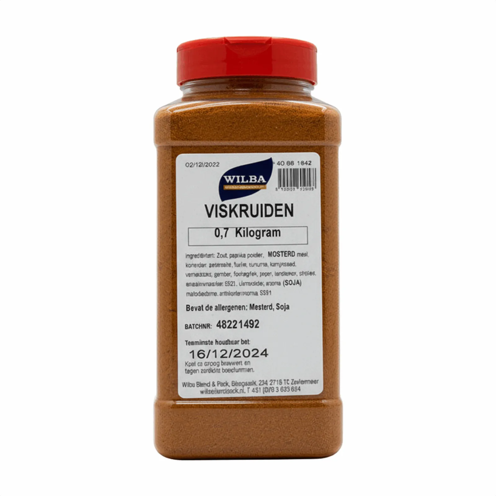Bij Compliment.nl koop je voordelig Wilba Viskruiden in een handige grootverpakking van 700 gram, perfect voor professioneel gebruik in horeca, viswinkels of voor de echte kookliefhebber thuis. Deze uitgebalanceerde kruidenmix geeft iedere visschotel een heerlijke, hartige en licht pittige smaak met een warme kleur. De combinatie van paprika, mosterd, koriander en diverse specerijen zorgt voor een volle, aromatische smaak die uitstekend past bij gebakken, gegrilde of gefrituurde vis. Dankzij de hoge kwaliteit en zorgvuldige samenstelling van Wilba blijven de smaken optimaal behouden, zelfs bij verhitting. Ideaal voor zalm, kabeljauw, schol of kibbeling en eenvoudig te doseren voor een constant smakelijk resultaat.