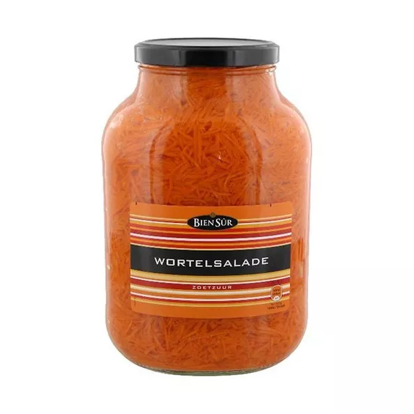 Een grote pot met fijngesneden wortelreepjes. Ideaal voor bij de salade of als garnering. Ook vanwege de heldere kleur. De wortelreepjes worden bewaard in zoet-zuur azijn. De pot heeft een gewicht van 2450 gram en een uitlekgewicht van 1350 gram.